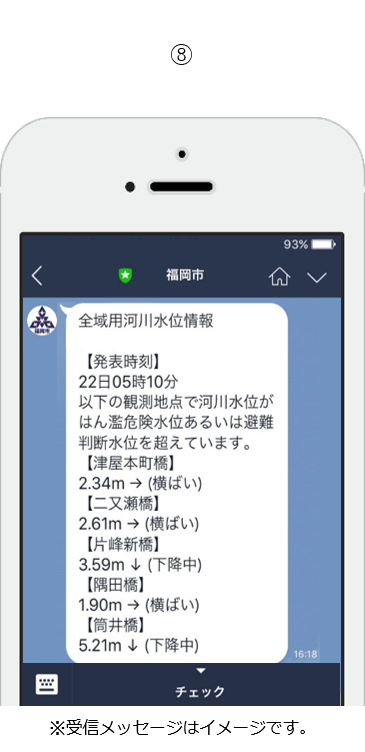「防災」・・・お住まいの地域に避難勧告が出されたとき、緊急情報がLINEで届く
