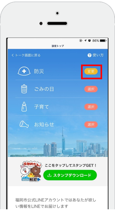 設定トップ ページ(④)で「防災」「ごみの日」「子育て」「お知らせ」の中からLINEで受信したい項目の「選択」ボタンをタップ。
